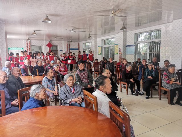 40名志愿者从伟德BETVLCTOR1946西大门出发前往敬老院。到达敬老院后,志愿者们安排好老人们就坐,随后志愿者们将用心准备的节目呈现给老人们。志愿者们在一首首红歌演唱以及四川话故事讲述中,带领老人们追忆峥嵘岁月;舞蹈串烧表演让老人们感受到老员工的朝气;声情并茂的朗诵让老人们看到老员工的活力;同时,志愿者们还为老人们带去了简单易学、有益身体健康的手指操教学。最后,在全体志愿者的大合唱《我和我的祖国》后,志愿者为老人们献上了小礼物并与之进行了深入交谈,到此,本次志愿活动也圆满结束。