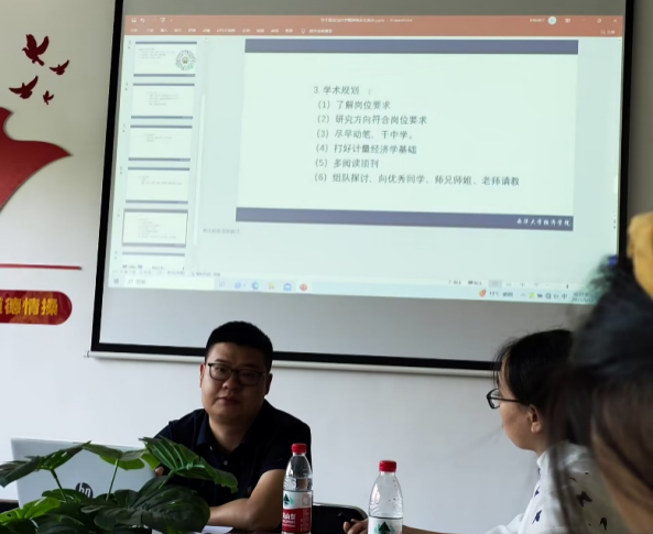 胡江老师则从专硕未来工作方向以及学术规划角度分享了自己的经验和建议。其指出员工应当了解工作岗位的需求,确定研究方向是否符合岗位需求。在学术规划方面,胡江老师建议员工多阅读金融学领域的顶刊,积极向身边优秀的同学和老师学习,在阅读与学习的过程中打好计量经济学的基础。