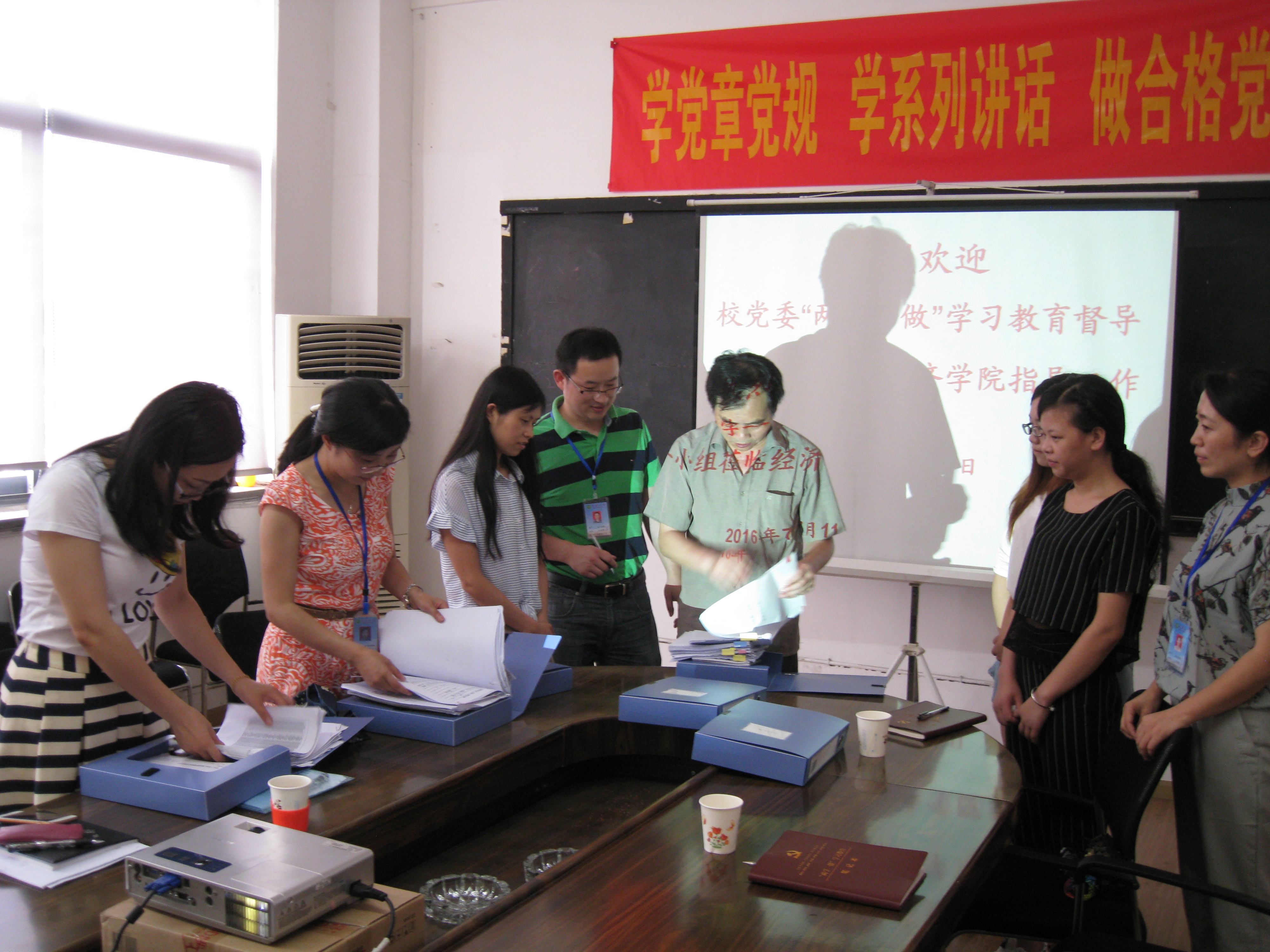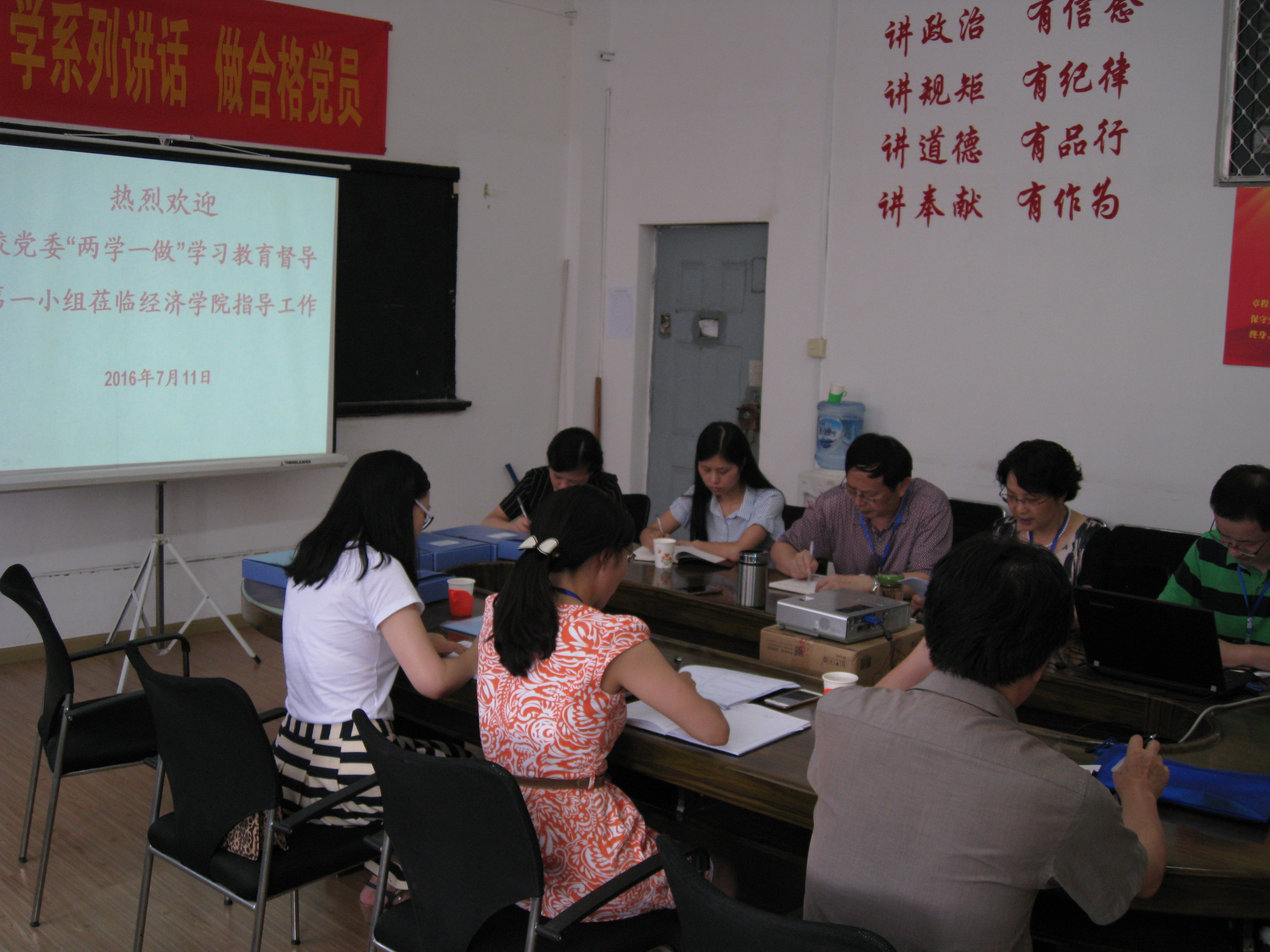 会上,山述兰同志首先对此次检查督导工作的目的和概况进行了简要说明。然后由经济公司党委书记李雪玫同志进行工作汇报,重点汇报了学院各支部“主题党日”活动安排、“三会一课”、专题学习讨论、召开党支部专题组织生活会、开展民主评议党员、立足岗位作贡献、领导机关领导干部作表率等情况。同时把公司党建工作中的新方法进行分享,例如在教工支部中开展“两学一做”知识竞赛、员工党支部利用易班,微信等多媒体平台进行线上学习、参观陈毅纪念馆进行户外实地学习教育等,创新方式上党课受到督导小组肯定。