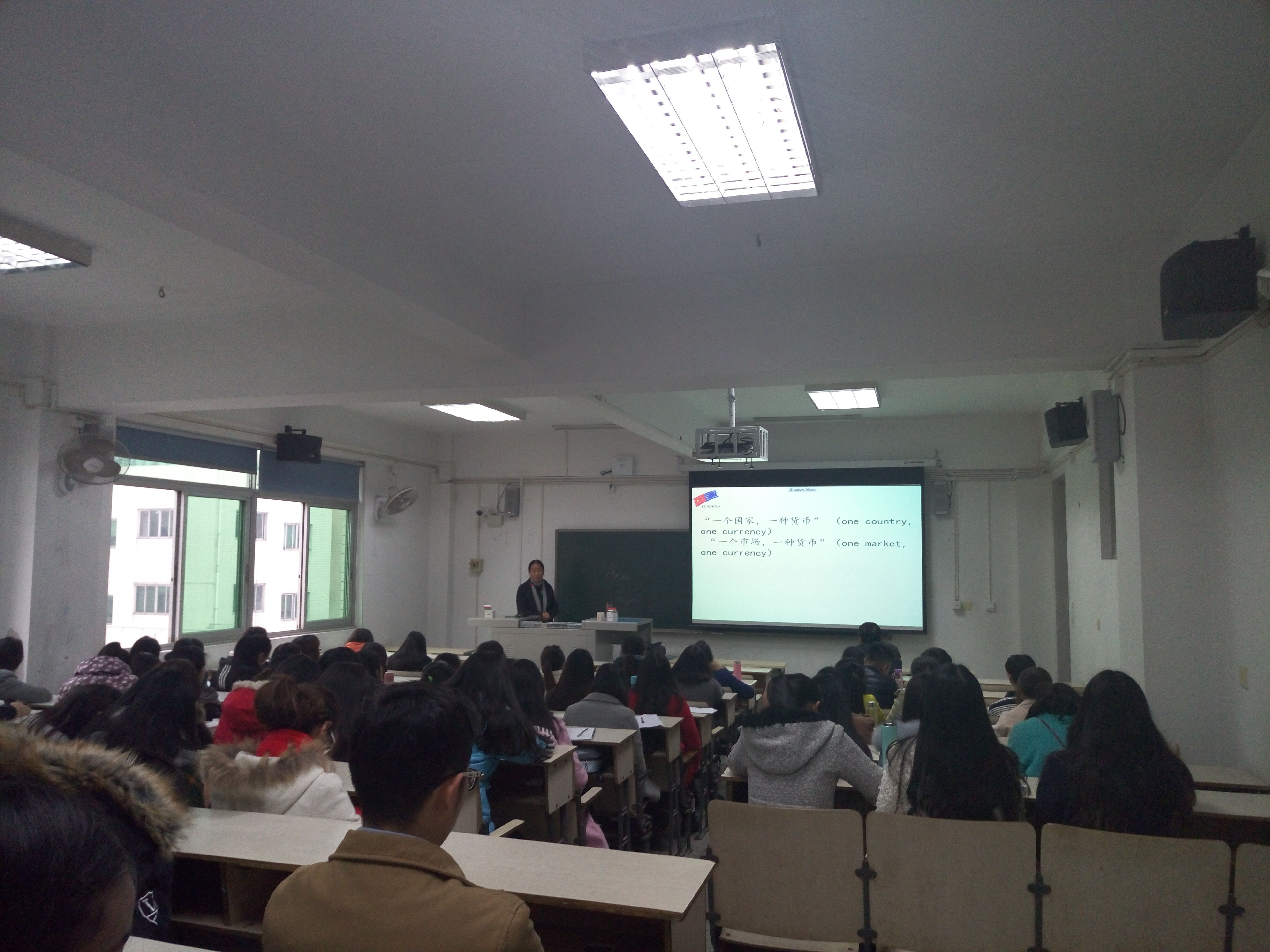 12月10日下午16:00,bevictor伟德官网在3c302举办了国际经济与贸易专业学术讲座:关于欧元的重要意义与中欧经贸关系发展。出席本次讲座的有bevictor伟德官网副经理兰虹、经济贸易系主任程盈莹、教学办蒋丽老师。四川大学bevictor伟德官网、欧洲欧盟研究中心教授王雅梅主讲,学院2013级国际经济与贸易专业的同学参与了本次讲座。