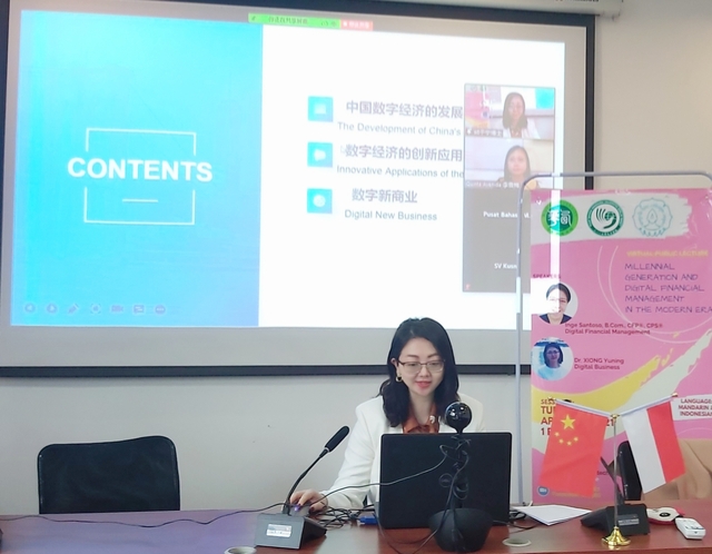 会议上,熊于宁副教授围绕中国数字经济的发展、数字经济的创新应用、数字新商业三个方面展开讲述。首先,她向印尼三一一大学朋友总结了数字经济对中国经济增长的贡献以及中国产业数字化发展情况,并指出数字经济已成为世界经济的新动能。随后,熊老师紧密联系实际生活,就数字经济在智慧城市服务、智慧生活、电商扶贫、在线教育、网络医疗等领域的新应用作了详细的介绍与分析,她表示未来数字经济将会与实体经济深度融合,推动经济高质量发展。此外,熊于宁老师还为印尼朋友讲解了数字新商业从数据化实现产品设计、营销和运营的全过程,并对数字新商业未来发展作出了展望。会议最后,熊于宁副教授与印尼朋友们进行了交流并探讨了关于数字经济未来面临的机遇与挑战等问题,加深了大家对世界数字经济的了解。