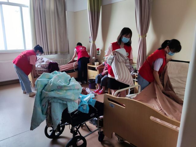 志愿者们为老人们整理内务