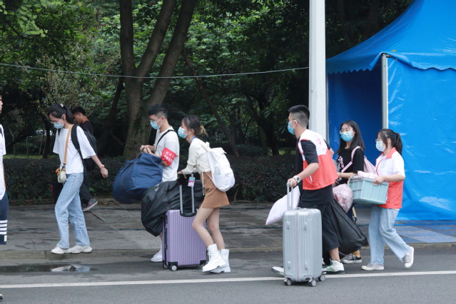 志愿者接过新生行李引导报到