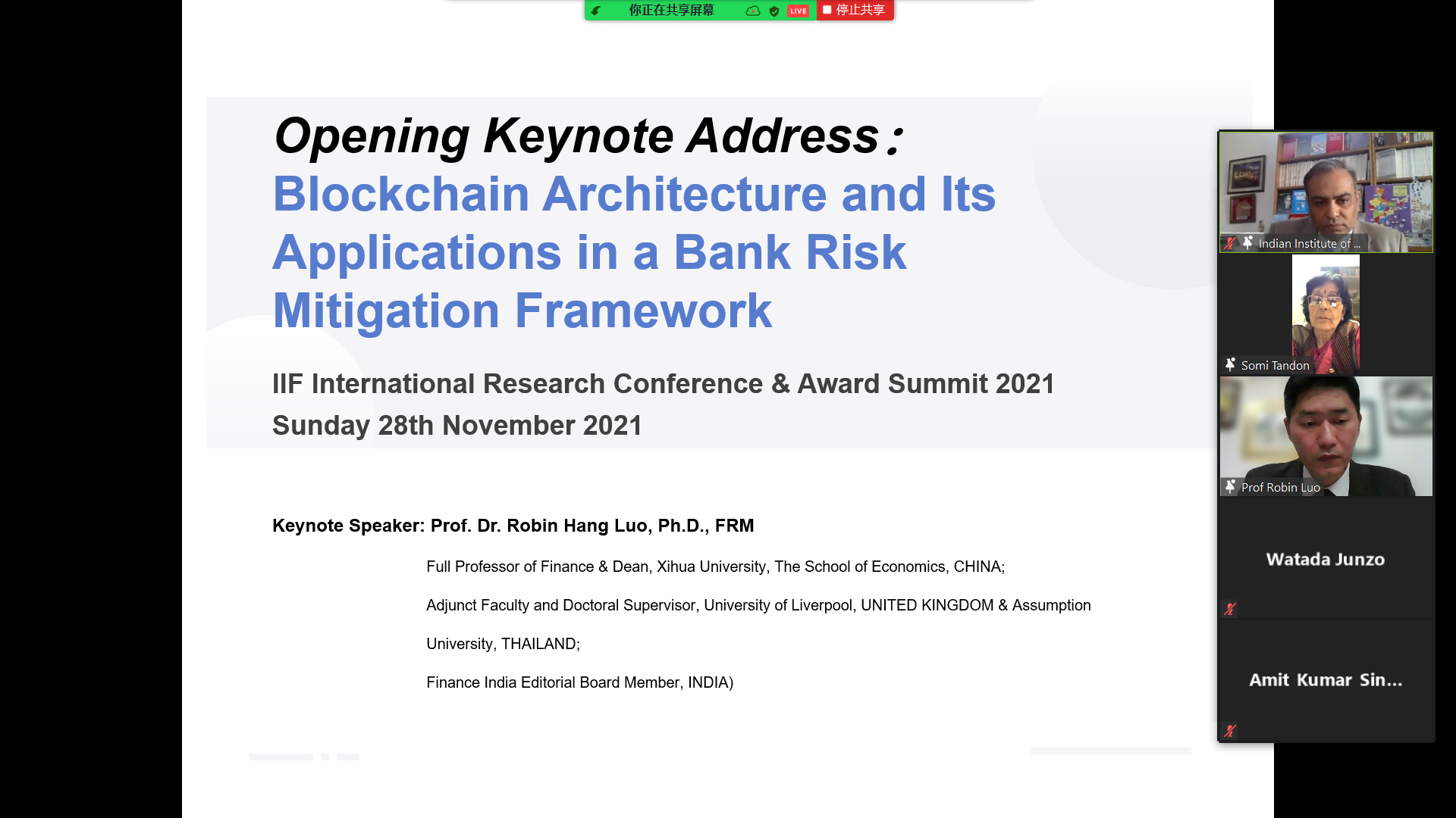 2021年11月27-28日和12月1-2日,由印度金融研究院(Indian Institute of Finance)主办的International Research Conference & Award Summit 2021国际学术会议通过在线方式顺利举行。会议由印度金融研究院经理J.D.Agarwal教授主持,来自46个国家、86所高校的500余名学者参加了本次学术会议,会议全程通过Facebook等主流媒体全球直播。