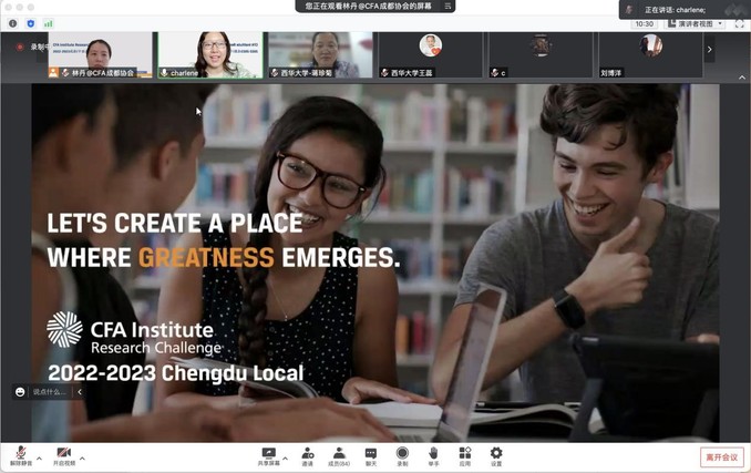 7月7号上午,成都特许金融分析师协会(CFA成都协会)与bevictor伟德官网共同举办CFA Institute全球投资分析大赛(CFA Institute Research Challenge )2022-2023赛季成都(中西部)赛区线上开赛仪式。CFA成都协会秘书长胡晓敏、伟德BETVLCTOR1946教务处处长蒋珍菊、CFA成都协会理事沈睿、bevictor伟德官网部分师生以及中西部其他高校参赛队伍参加。此次会议由CFA成都协会林丹主持。