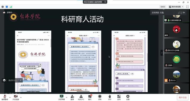 第一场金融科技专业认知教育活动于9月6号上午在腾讯会议召开,会议由金融科技专业辅导员苟小小老师主持,参会老师包括金融投资系系主任王蕊老师、系副主任马江明老师,青年教师杜坤海老师、王骁玮老师和冯青琛老师。会上,王蕊老师着重介绍金融科技专业团队力量、研究平台、学位点与专业建设情况、专业培养目标、课程架构和竞赛成果,马江明老师介绍了金融科技专业前景和专业需求,杜坤海老师、王骁玮老师和冯青琛老师向新生教授专业学习经验。王蕊老师强调金融科技专业是公司新兴开设专业,专业紧跟时代发展脉络,呈现出综合性强、创新程度高的特点。大学时光如“白驹过隙”,希望大家充分利用大学时间,扎实掌握专业知识、拓展专业技能、丰富兴趣爱好,不负青春、不负韶华;不负梦想,不负未来。