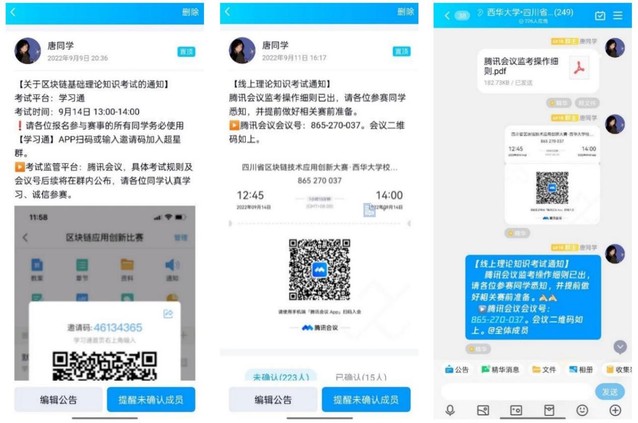 9月14日13:00-14:00进行校内赛理论考试。鉴于疫情形式,采用学习通超星平台组织参赛同学进行理论考试,同时采用腾讯会议作为考试监管平台。考试题目涵盖区块链概论、区块链关键技术和区块链应用展开,考试形式为客观题,由超星自行评分。各小组的每个组员都需参与答题,并以小组平均分计入理论总分(占比40%)。