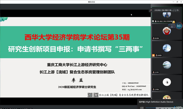 最后一个阶段,李益同学根据自己的实操经验,针对研究生创新项目申报,详细阐述了值得注意的各方面细节,并以实际经历重点建议:了解哲学社会科学项目的分类,努力培养团队的合作能力,重视项目书中的填报规范。此外,李益同学也强调要基于国家和地方经济、社会发展的实际需求,从时政热点、导师的研究方向、个人的研究兴趣等角度出发去挖掘选题。