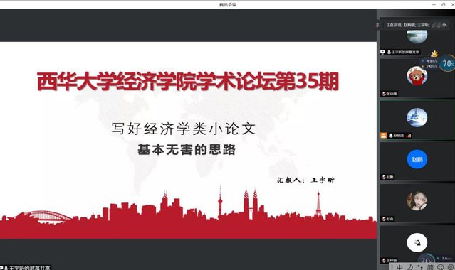 论坛过程分为三个阶段。在论坛的第一个阶段,王宇昕老师作了主题为“写好经济学类小论文”的报告,详细介绍了论文的选题构思、框架设计、操作步骤以及优化提升等几个方面的内容,并且向同学们分享了论文写作过程中的一些实际经验和需要注意的问题。