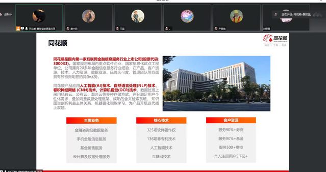 首先,魏智慧老师向同学们介绍了同花顺以及“云上•雏鹰计划”线上实习项目的背景。同花顺是国内第一家互联网金融信息服务行业上市公司(股票代码:300033),主要有金融信息服务和AI人工智能技术两大板块。本次“云上·雏鹰计划”是该公司基于疫情防控大环境,解决员工跨区域实践实习困难、促进复合型人才培养而建立的校企深度合作项目。该项目依托同花顺AI数据标注平台,由员工远程进行数据人工处理等相关工作。