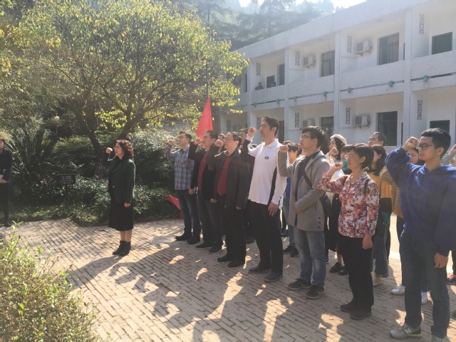 在邓稼先旧居的纪念铜像前,大家排好队,依次上前献上鲜花,深深的鞠躬,表达我们崇高的敬意与深深的感谢,全程没有人说话,大家都在静默,都在悼念那已远去的人。全体党员同志在公司党委书记李雪玫书记的带领下,重温入党誓词,大家庄严宣誓。