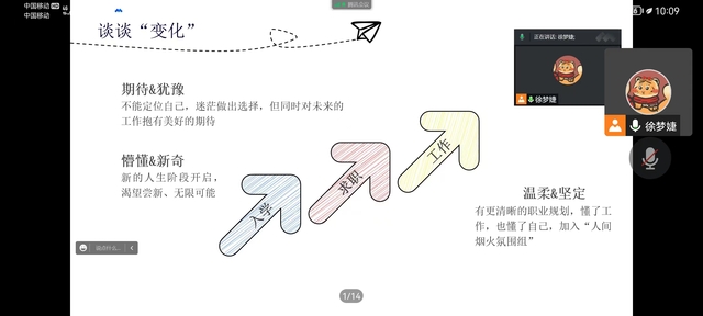 徐梦婕现就职于招商银行股份有限公司成都分行,以市场营销培训生的身份进入招行,目前正处于轮岗学习中。她围绕入学、求职、工作的成长变化展开讲述。其中,她重点介绍如何选择工作即选什么、怎么选、哪里选,并强调要选择适合自己角色的工作,脚踏实地、放远眼光、降低期待,多渠道地了解实习或工作。徐梦婕以自身经历讲述求职过程并提出中肯建议,例如简历要简洁美观,突出个人优势,贴合工作岗位描述;笔试应适当参考银行考试题册,了解题型和规律等。随后,她列举了银行面试时常见问题并进行答疑,解决同学们求职目标不明确、考研与工作平衡等问题。