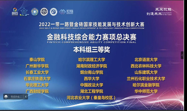 近期,2022“一带一路”暨金砖国家技能发展与技术创新大赛金融科技综合能力赛项线上比赛隆重举行,公司窦峥、王蕊两位老师带领金融科技专业员工宋延洁、贺敏、季小琳、庞婷等组成的参赛队伍,在来自全国60余支高校参赛队伍中脱颖而出,荣获总决赛本科组三等奖的优秀成绩。