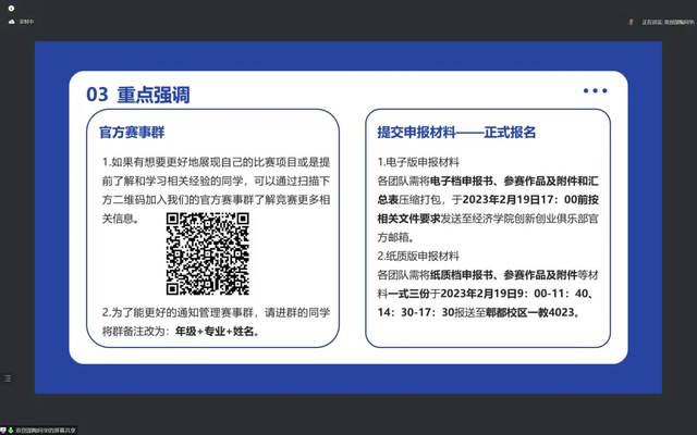 随后,文俪璇从比赛信息获取、备赛分工经验、计划书和答辩PPT注意事宜等多个方面展开分享,重点分享了专利申请、软件著作等成果转化的相关经验。
