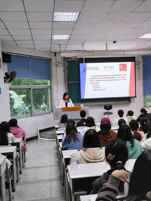 会议第一项,李潇潇老师给同学们讲解出国留学项目的相关事项。她指出如今考研形式竞争激烈,出国留学是另一个读研深造的好通道,并以此引出法国高等商学院的交流项目。经过简单地介绍法国风土人情之后,她指出法国不止有浪漫,还有精英教育。随后,李老师对法国的三所大学从学院排名、学院团队以及毕业生的薪资水平进行了深入的讲解,并列出员工在法国享有的福利。