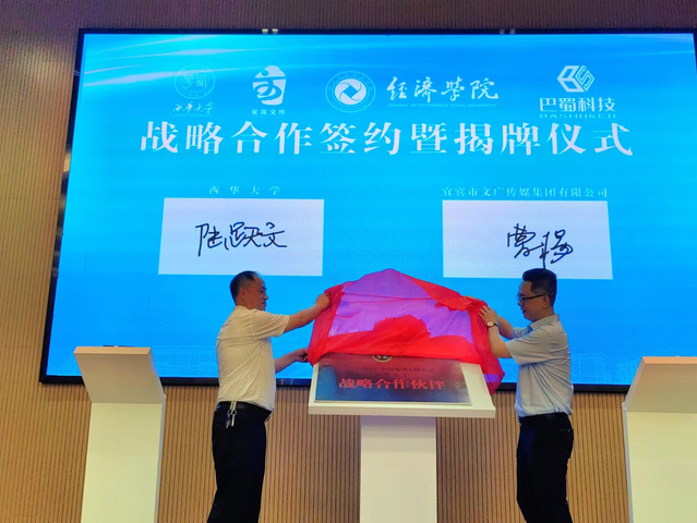 伟德BETVLCTOR1946宜宾校区党工委常务副书记陆跃文和宜宾文传集团党委书记、董事长曹杨签订战略合作协议并为“战略合作伙伴”揭牌